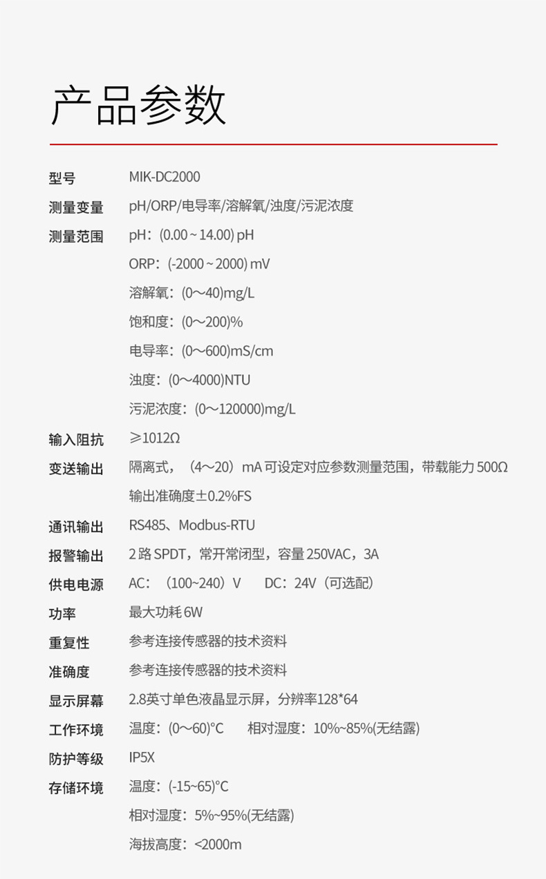MIK-DC2000水质通用型控制器,适用于与本公司多种水质系列数字传感器配套使用,用于监测包括 pH、ORP、电导率、溶解氧、浊度、污泥浓度等水质参数,监测的参数通过 RS485 或电流变送输出到监控室进行记录保存,广泛应用于火电、化工、化肥、冶金、环保、制药、生化、食品和自来水等行业中的溶解氧、饱和度和温度的连续监测。