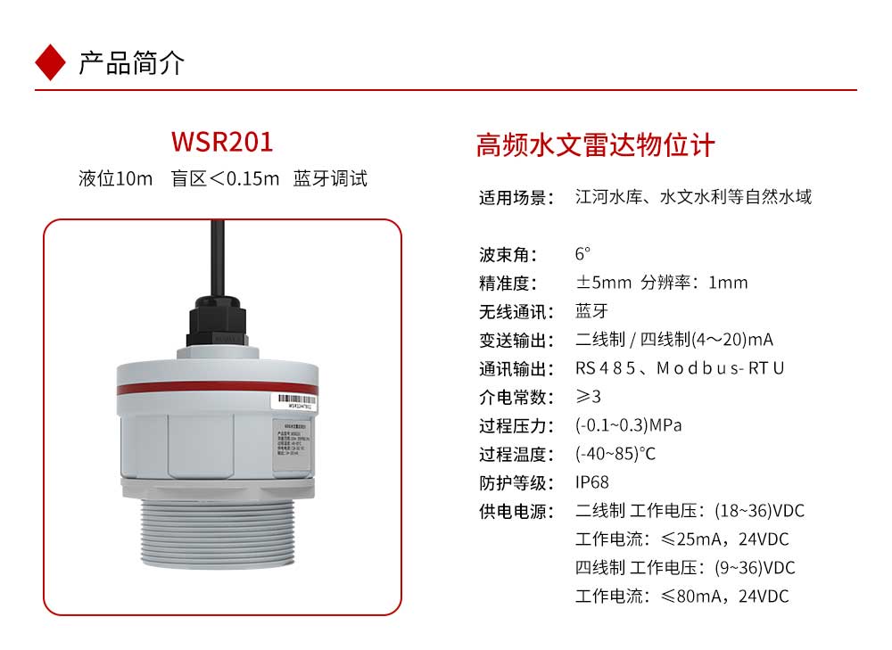 WSR201雷达液位计是利用高频微波雷达技术实现对水文信息的实时监测和精准测量。相较于传统的水文监测方法,雷达技术具有测量精度高、实时性强、适用范围广等优势。本产品波束能量低,对人体及环境均无伤害,还具有不受介质比重的影响、不受介电常数变化的影响、不需要现场校调等优点,广泛应用江河、水库、湖泊、灌渠、河道等自然水域水文监测场合。